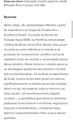 Entendo ser importante registrar vivências e compartilhar aprendizados… Por isso, socializo com vocês o meu artigo chamado Grupo de Estudos Afro-brasileiros (Geab): reflexões sobre a educação das relações étnico-raciais, publicado na revista @rquivo Brasileiro de Educação da PUC Minas. Para baixar o artigo, clique aqui.
