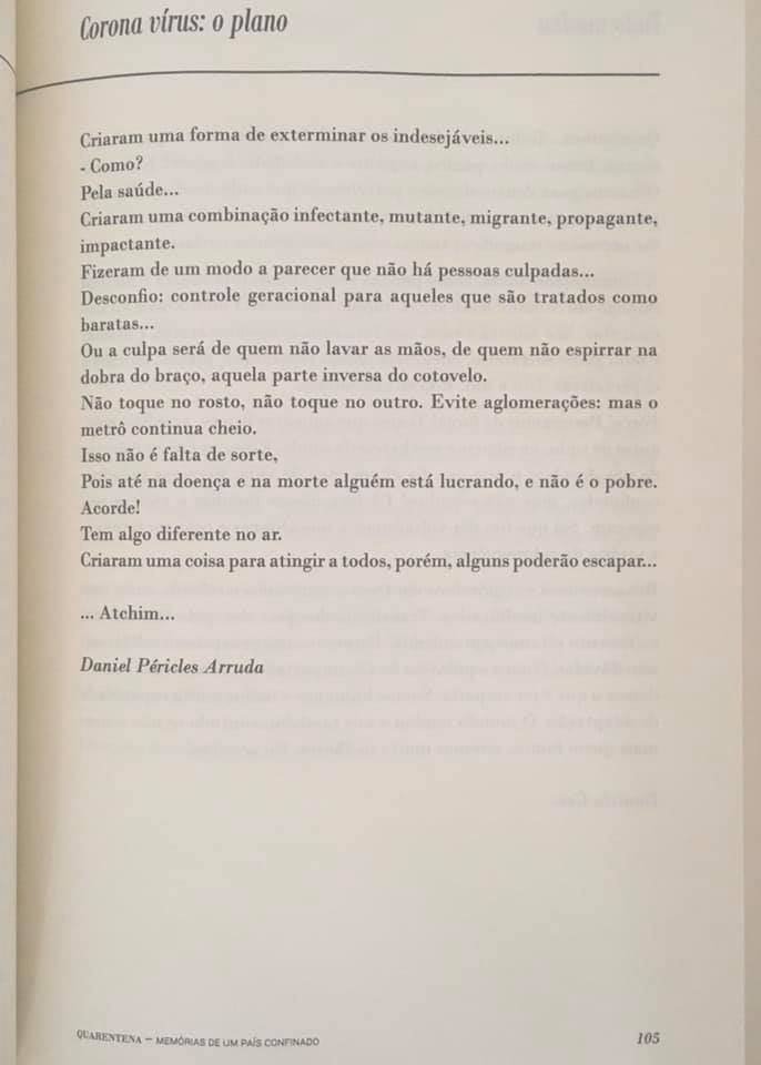 Satisfação em participar da Antologia Quarentena: memórias de um país confinado com a poesia Coronavírus: o plano, pela editora Chiado.