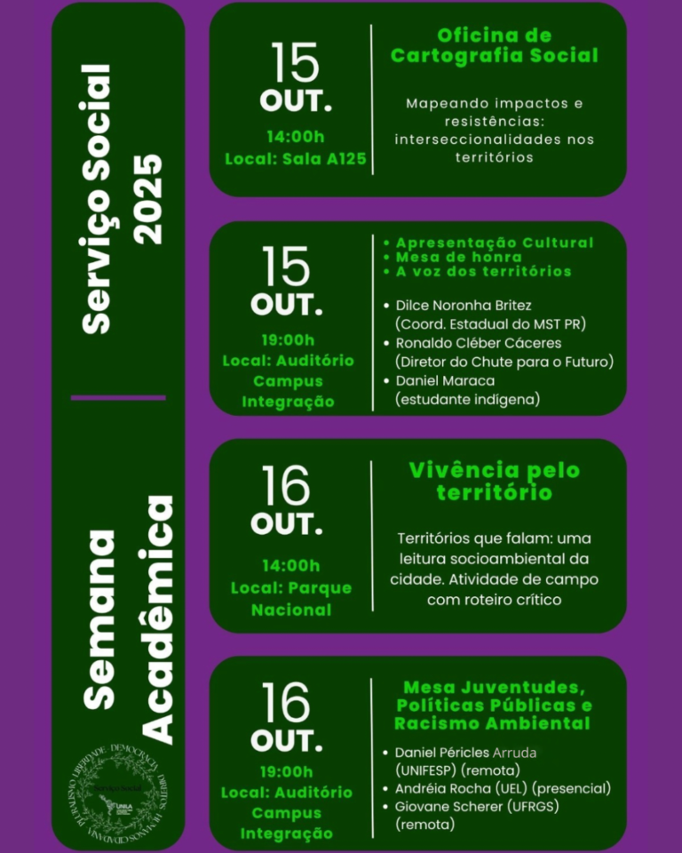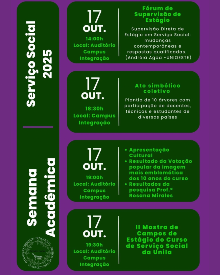 Semana Acadêmica do Curso de Serviço Social da Universidade Federal da Integração Latino-Americana (UNILA), Campus Integração, de 15 a 17 de outubro de 2025.